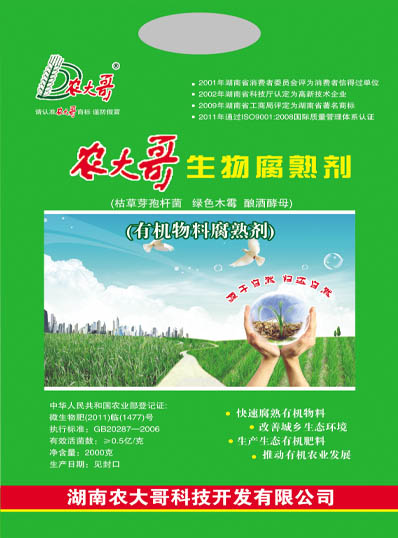 農(nóng)大哥生物腐熟劑系我司自主研制開發(fā)的新型高效活性微生物菌劑。本產(chǎn)品富含分解纖維素、半纖維素、木質(zhì)素和其他有機(jī)物的微生物菌群,在適宜條件下,可迅速腐解作物秸稈、畜禽糞便、雜草、塘泥、城市生活垃圾等有機(jī)物料,將有機(jī)物轉(zhuǎn)化成作物能夠吸收利用的營養(yǎng)成分,而且還能除臭滅菌。適用于制備有機(jī)肥、生物有機(jī)肥、秸稈還田。